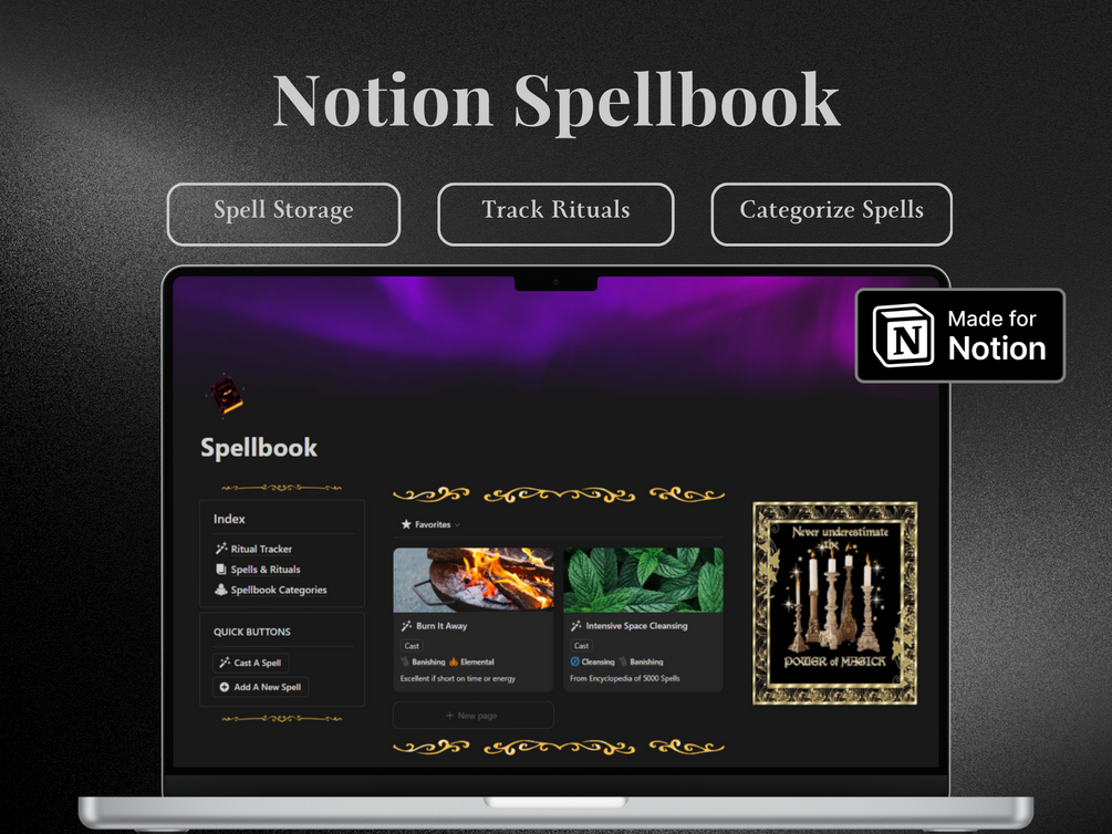 - What is the Notion Spellbook & Ritual Tracker Template for?The Notion Spellbook & Ritual Tracker is designed to help you organize and manage your magical practice. It provides a dedicated digital space within Notion to store your spells, rituals, correspondences, magical recipes, and more.